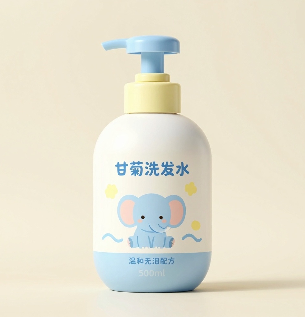一个婴儿专用洗发水包装设计,500ml塑料瓶,品牌名“甘菊洗发水”。风格温馨可爱,采用柔和的浅蓝色和奶白色为主色调,搭配淡黄色点缀。设计元素包括可爱的卡通小象插画、云朵图案和柔和的波浪线条。整体造型圆润安全,字体圆胖亲切,突出“温和无泪配方”和“专为婴儿设计”的信息。