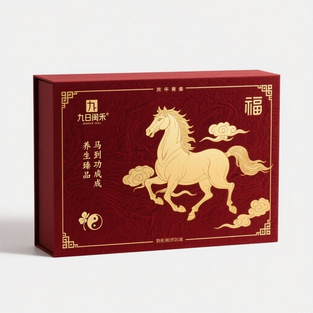 - **设计元素**:背景层为暗红丝绒质感底纹;主图案为工笔金线勾勒的奔马与祥云组合;装饰图案含回形纹边框与篆体“福”字角花;装饰线条为烫金细线分隔图文区域;小图标为四叶草与太极阴阳鱼组合象征养生平衡;材质选用高克重特种纸带压纹触感。
