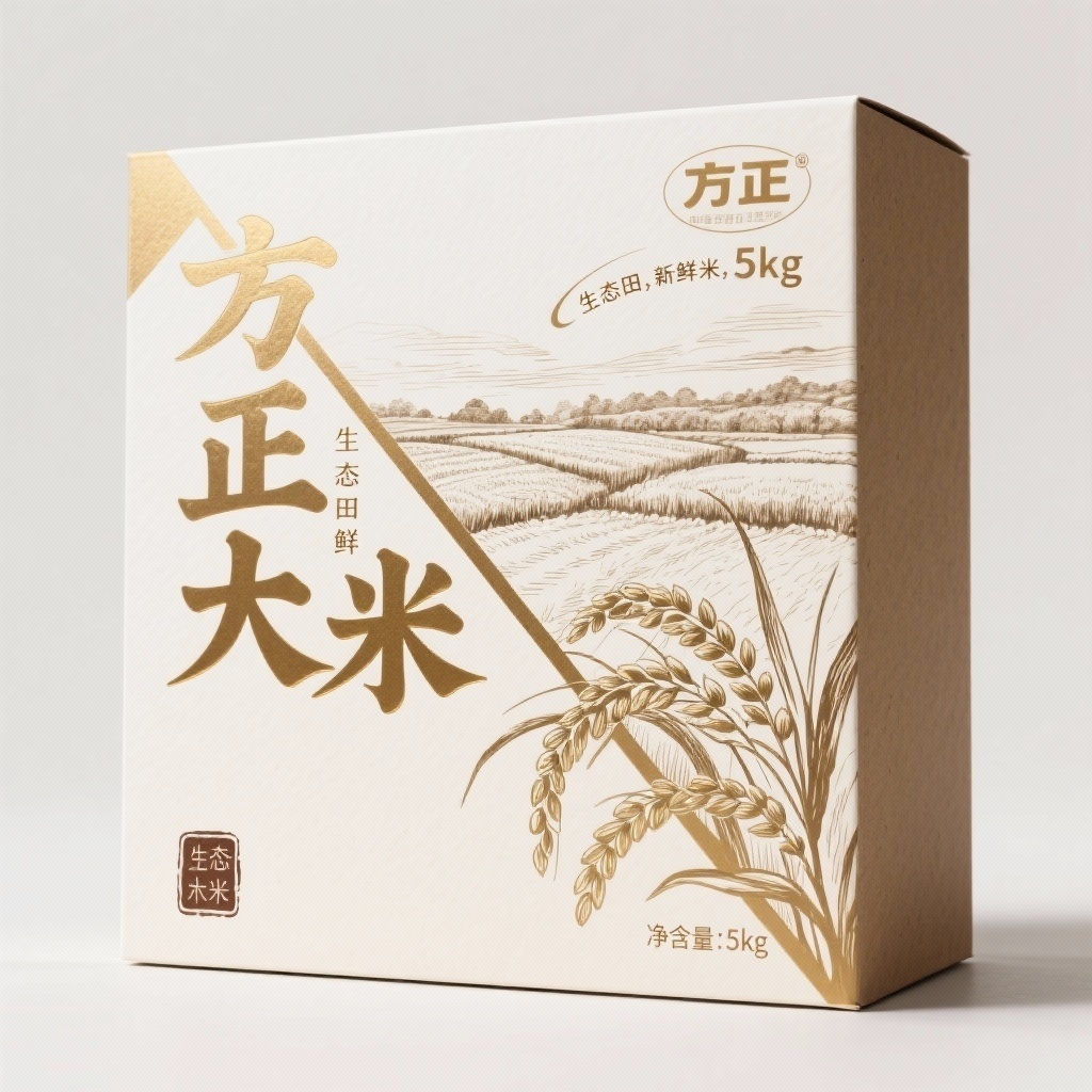 - **设计元素**:手绘复古稻田全景插画、经典稻穗纹理背景、"方正大米"装饰艺术字体、"生态田,新鲜米"凸版印刷标语、醒目净含量5kg标识;纸盒采用哑光艺术纸材质,表面呈现轻微肌理感以强化复古触觉体验。