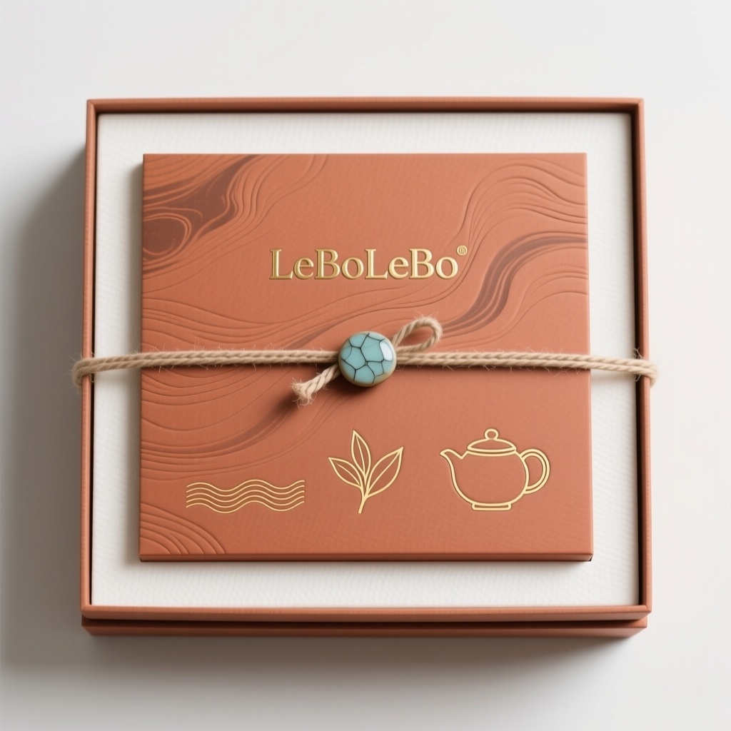 - **设计元素**:背景层为暖赭石色触感纸基底,满幅压凹水墨氤氲与钧窑釉彩流变纹理;主视觉仅品牌名“LeBoLeBo”采用哑金击凸;装饰元素为三枚釉色微凸线性图标(水·叶·器),边缘辅以极细哑金描边;绑带为本色棉麻绳,结扣处嵌入微型青釉冰裂纹瓷片;内衬月白色天然木浆模塑,与外盒形成温润触觉对比