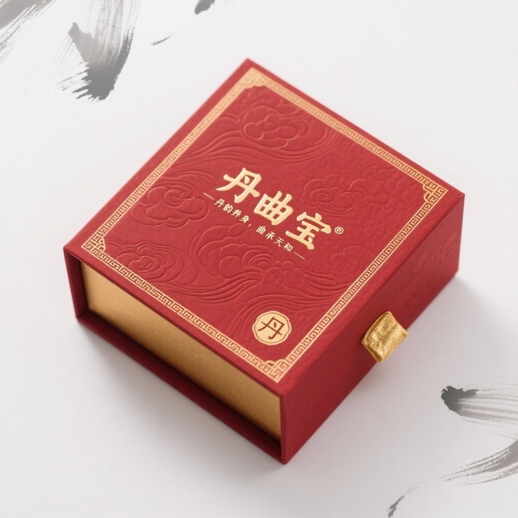 - **设计元素**:哑光红色特种纸基底搭配局部亮面UV涂层;主视觉区大面积烫金品牌文字;背景层压印极细金线云纹暗花;盒盖边缘环绕0.5cm宽描金回形纹装饰带;正面右下角嵌入金色篆体“丹”字徽章图标;内衬使用丝绒触感金箔纸