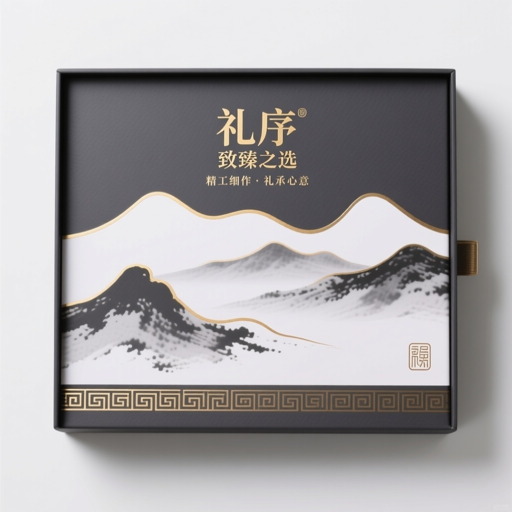 - **包装主视觉面排版**:上下排版(文字在上图案在下)——顶部居中排布品牌名“礼序”与宣传语“致臻之选”,采用无衬线粗体大字强化识别;下方为横向延展的抽象山水纹理图案,作为视觉重心承载文化意境,图文比例约为3:7,形成稳重而有呼吸感的布局。