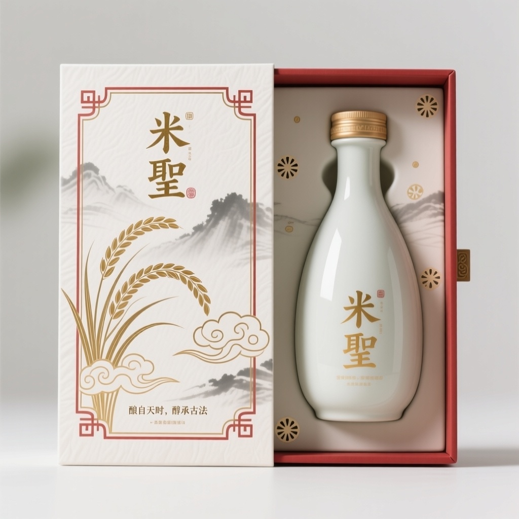 - **设计元素**:背景层为淡墨晕染肌理;主图案为工笔勾线稻穗与云纹组合;装饰线条采用朱砂红细边框与金色回纹;点缀“米粒形”镂空小图标;外盒材质模拟宣纸触感,瓶身带哑光釉面陶瓷质感