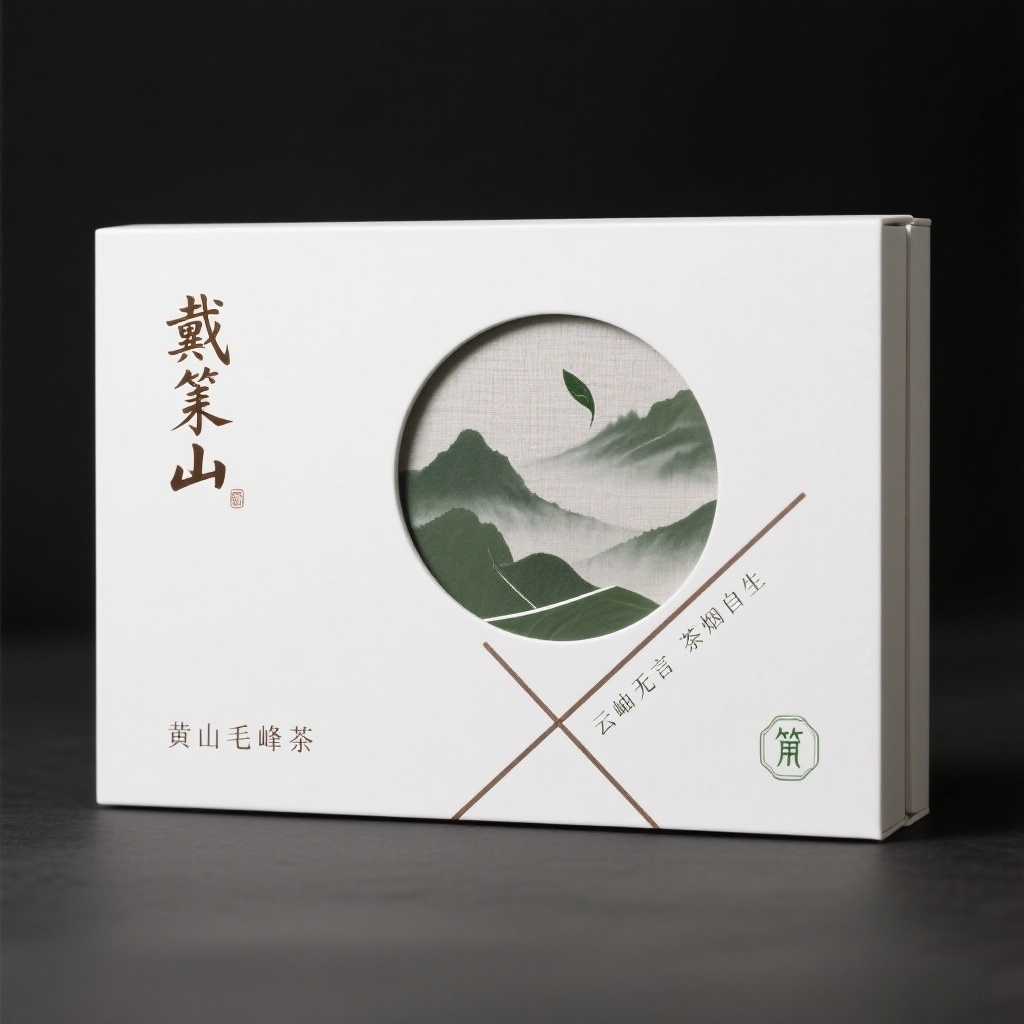- **包装主视觉面排版**:左右排版——左侧垂直居中排列品牌名“戴箬山”,采用行楷书法体,深棕色压印于纯白底上,右侧大面积留白中嵌入圆形镂空窗,透出内层灰绿山水肌理;窗下以几何切割斜角线框承载“黄山毛峰茶”字样,现代无衬线字体与书法形成张力,整体左实右虚,视觉节奏舒缓有度。