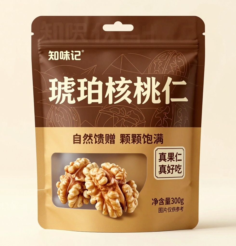 - **包装主视觉面排版**:上下分区式排版——上三分之二深棕区为品牌表达层,左上角无衬线“知味记”LOGO沉稳锚定,中央几何抽象字“琥珀核桃仁”横向延展,背景嵌入极简山核桃外轮廓线描图案作为肌理;中部纯色横幅“自然馈赠 颗颗饱满”如封印带贯穿视觉重心,右下角矩形标签“真果仁 真好吃”点睛收尾;下三分之一金棕区为信息与开窗联动区,左侧为透明开窗位展示真实核桃仁(2颗去壳),右侧等线字体“净含量300g 图片仅供参考”纵向排列,文字与开窗形成内容呼应。
