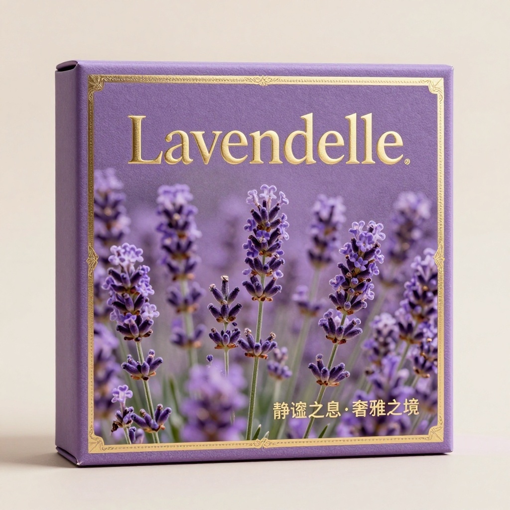 - **包装主视觉面排版**:满版排版(写实薰衣草花丛从底边向上蔓延覆盖90%版面,花瓣局部做UV高光凸起处理;品牌名以粗衬线体横向居中置于顶部,全文字体烫金+外轮廓微浮雕UV;宣传语以纤细小字烫金排列于右下角,形成低调奢华收尾)