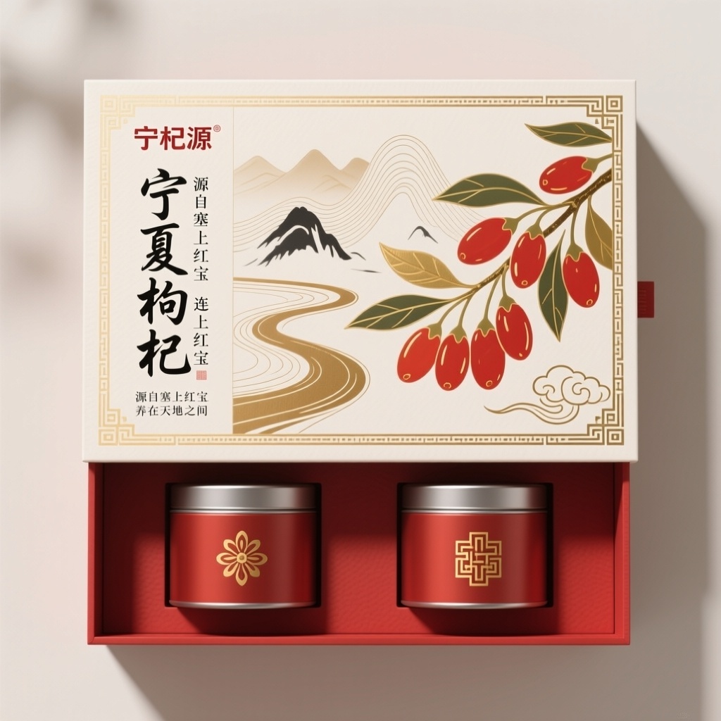 - **设计元素**:背景层为贺兰山与黄河抽象水墨线条晕染;主图案为写实风格枸杞果实与舒展枝叶,采用微凸烫金工艺增强立体感;装饰图案含回纹边框与飘逸祥云角饰;装饰线条为鎏金细线分割图文区域;小图标为枸杞花蕊简化图形,用于罐体封口处;整体使用哑光米白特种纸,触感温润如宣纸。