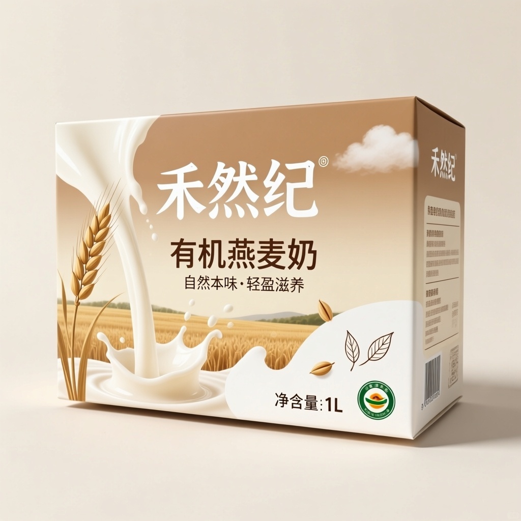 产品:有机燕麦奶;品牌名:禾然纪;包装样式:食品自立袋;包装主视觉面排版:采用覆盖式排版,顶部居中放置品牌名“禾然纪”白色粗衬线体字,置于柔焦燕麦田渐变背景之上,下方以浅米色半透明色块承载产品名称“有机燕麦奶”及宣传语“自然本味·轻盈滋养”,底部居中排列净含量“1L”与有机认证图标;设计风格:清新自然的极简田园风,强调天然、温和、可信赖感;设计元素:背景层为低饱和度手绘风燕麦穗淡彩晕染,主图案为左侧倾斜悬浮的哑光质感燕麦奶倾倒液态动态剪影,装饰图案为右下角散点分布的微缩麦粒与叶片线描小图标,辅以细朴拙手写风分割线与圆角米白底色块;主题配色:主色为燕麦浅褐,辅色为云朵柔白。