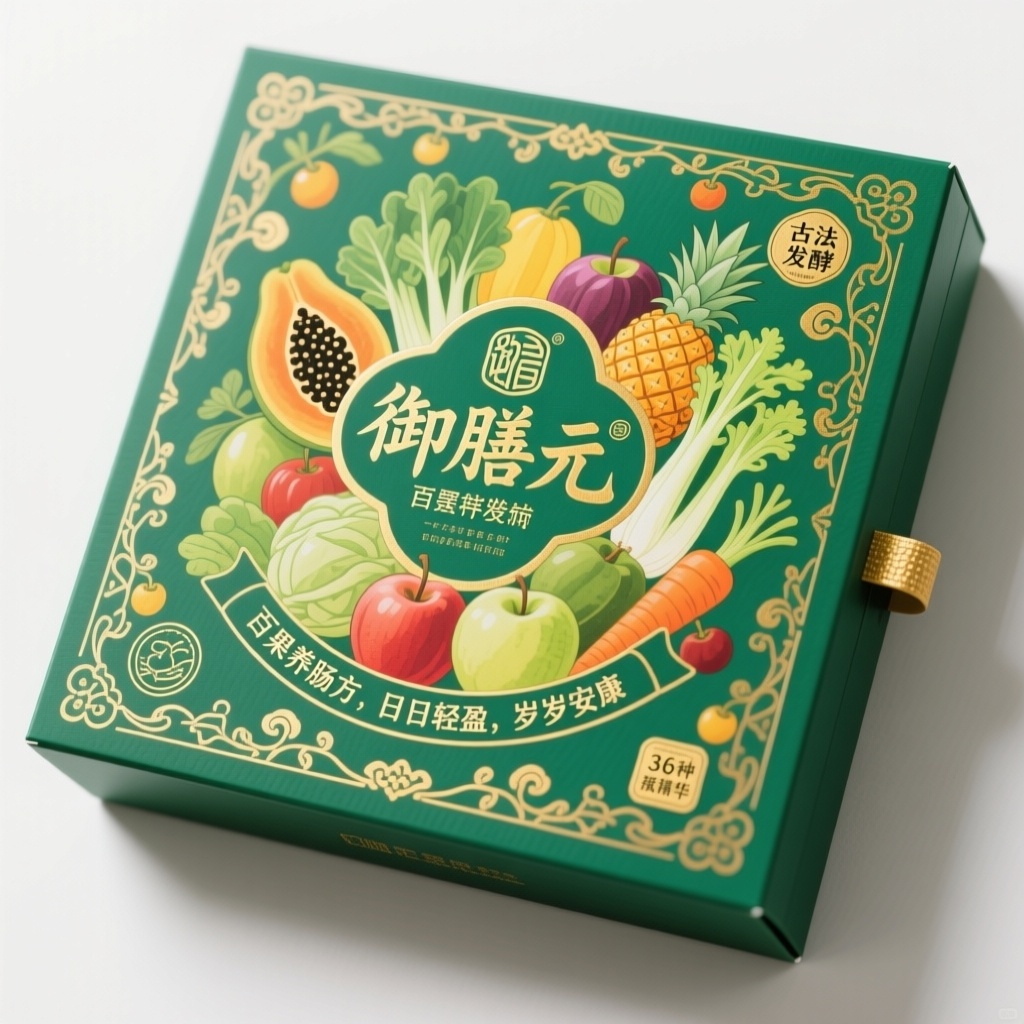 - **设计元素**:背景层为哑光绿底叠加半透明蔬果水彩纹理,主图案为高饱和度手绘蔬果组合群像,装饰图案含祥云金纹、果实藤蔓缠枝纹、小图标含“古法发酵”“36种果蔬精华”金色印章标识,材质选用触感纸带轻微浮雕压纹