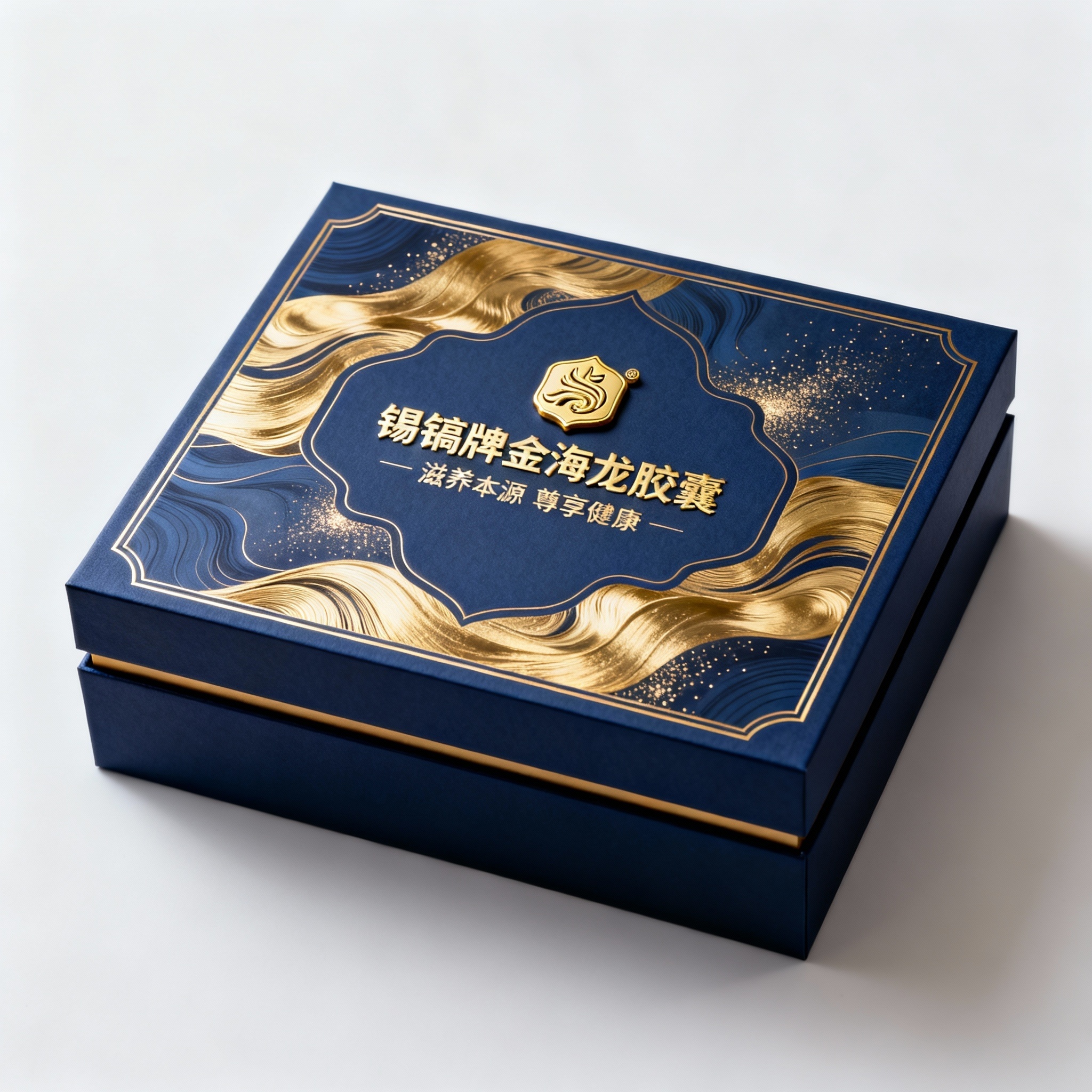 - **包装主视觉面排版**:覆盖式排版(抽象金色流动线条作为底层背景纹理,品牌名称“锡镐牌金海龙胶囊”居中置于深蓝色哑光色块之上,烫金logo悬浮于文字右上方形成视觉焦点,宣传语以细体小字横向排列于主标题下方)