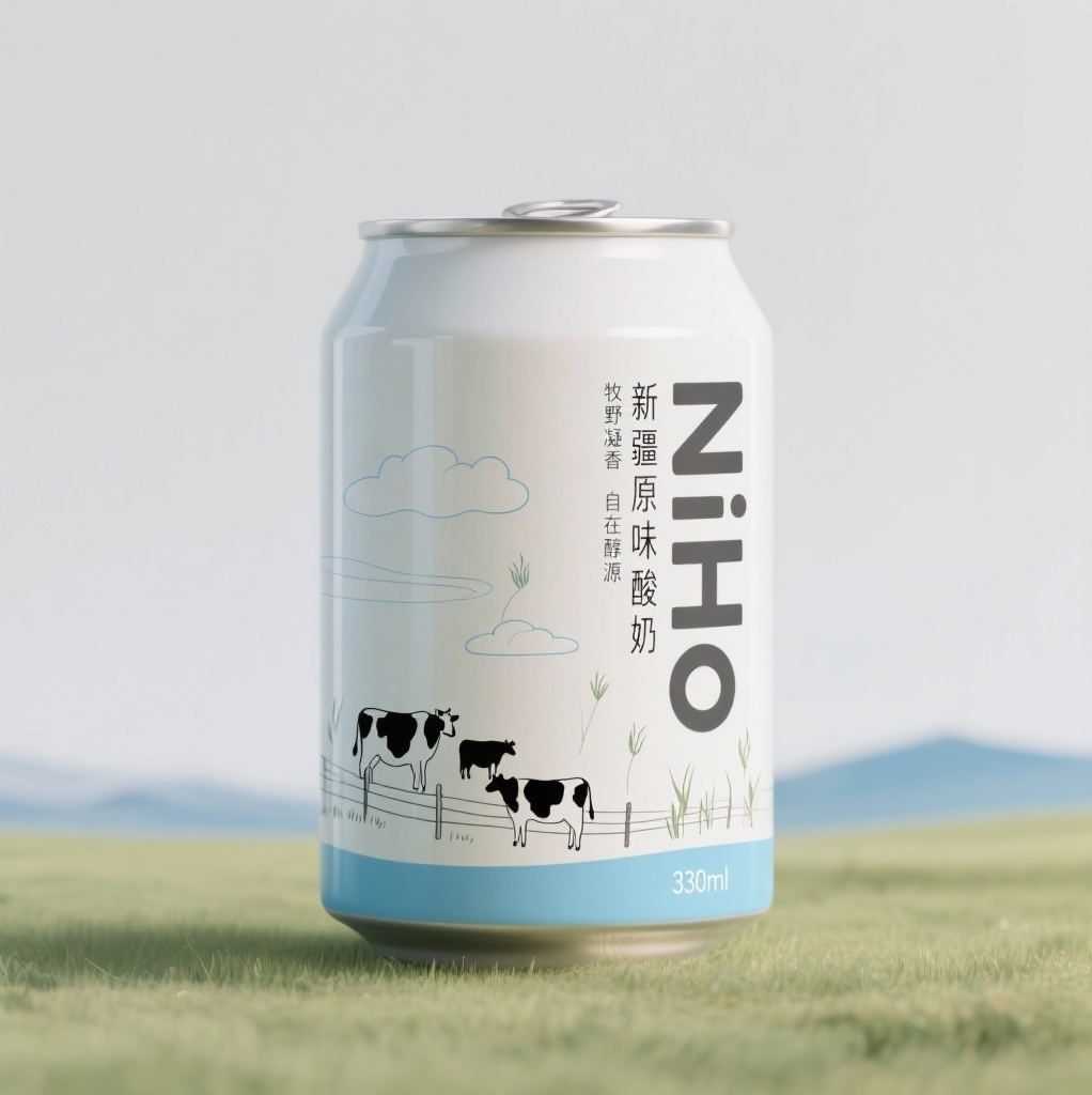 - **包装主视觉面排版**:满版图文排版(罐身以横向流动构图呈现:左侧1/3为抽象化牧场剪影——低矮围栏、三两奶牛轮廓、飘动云朵;右侧2/3大面积留白中,“NiHo”垂直居右粗体悬挂,下方错落排列“新疆原味酸奶”与宣传语,文字如牧草般自然生长于画面,底部浅蓝地平线色带收尾)