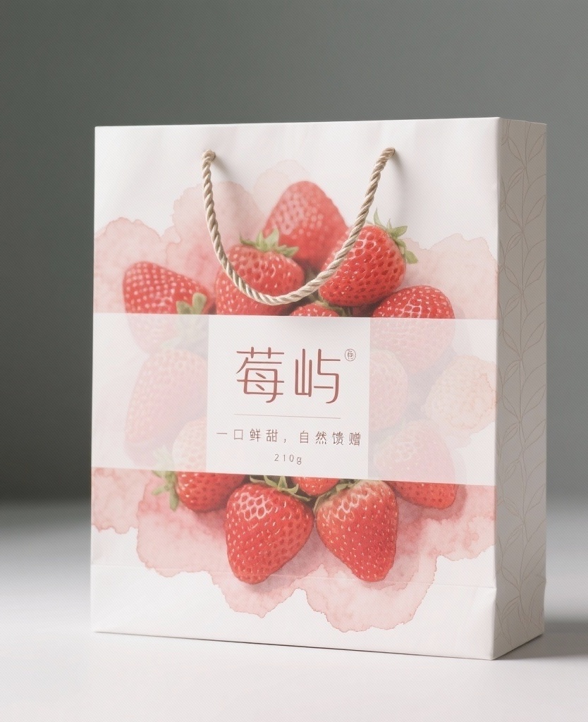 - **设计元素**:210g哑光白卡纸基材触感温润;背景层为低饱和度水彩草莓肌理晕染;中央品牌文字区块带微透明白色衬底;无装饰边框或线条;侧缝处压印极细叶形连续暗纹;手提绳孔位周边做圆角微凹陷工艺提示