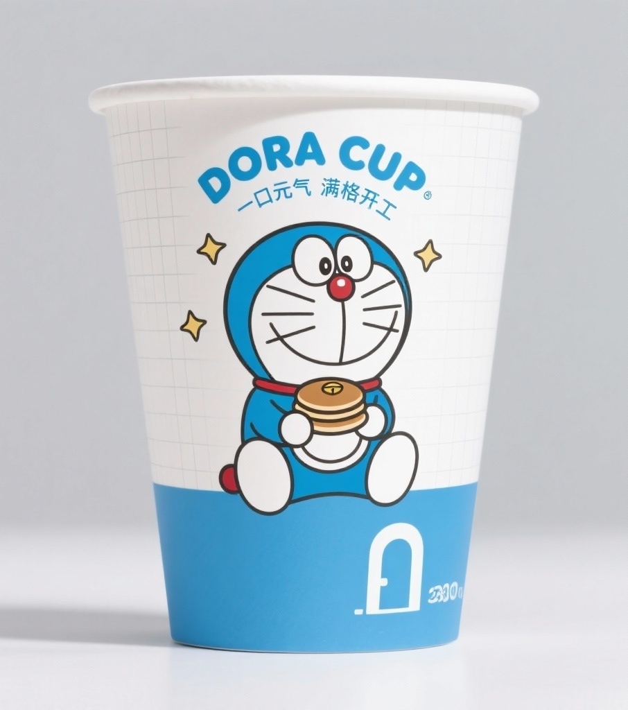 - **设计元素**:背景层为哑光白底+若隐若现的浅灰网格线模拟笔记本纹理;主图案为官方授权哆啦A梦标准坐姿形象(手持铜锣烧);装饰元素含三颗悬浮小星星沿杯口内圈分布,杯底压印迷你任意门轮廓;采用230g食品级淋膜纸呈现柔韧触感