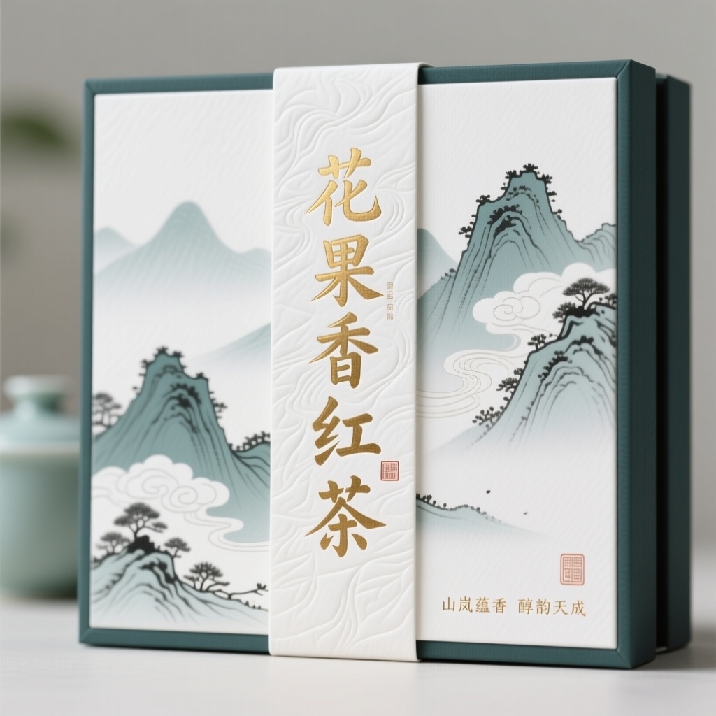 - **包装主视觉面排版**:以文字为主式排版(主标题如建筑立柱贯穿画面,图案化为气韵背景)——竖排烫哑金品牌名纵向占据中央黄金轴线,笔画粗细随山势起伏微妙变化;工笔茶山轮廓以5%透明度淡墨晕染于文字背后,如影随形;云雾纹理局部UV压印于文字转折处,似墨迹未干;宣传语横向小字如印章落款,轻置于右下角负空间,整体如一幅题跋山水,文骨图韵,气脉贯通。