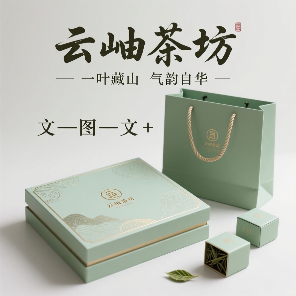 - **设计元素**:背景层为哑光浅绿色特种纸,触感温润;主图案仅为中央UV光油凸印品牌Logo,无多余图形;装饰线条使用极细烫金线勾勒盒边与文字轮廓;小图标含茶叶脉络暗纹压底于盒盖四角;手提袋沿用同款纸材,提手处加厚棉绳增强承重与手感。