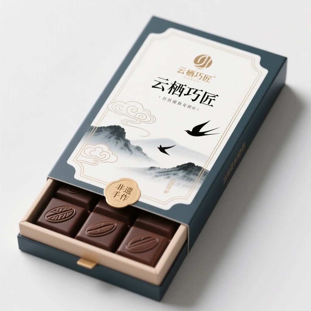 - **设计元素**:背景层为宣纸肌理底纹,主图案为水墨晕染的云山与抽象飞鸟,装饰图案为细线勾勒的祥云边框与巧克力融滴微纹理,装饰线条为0.5pt浅灰金回纹细线,小图标含可可豆线描图标与“非遗手作”烫金徽标