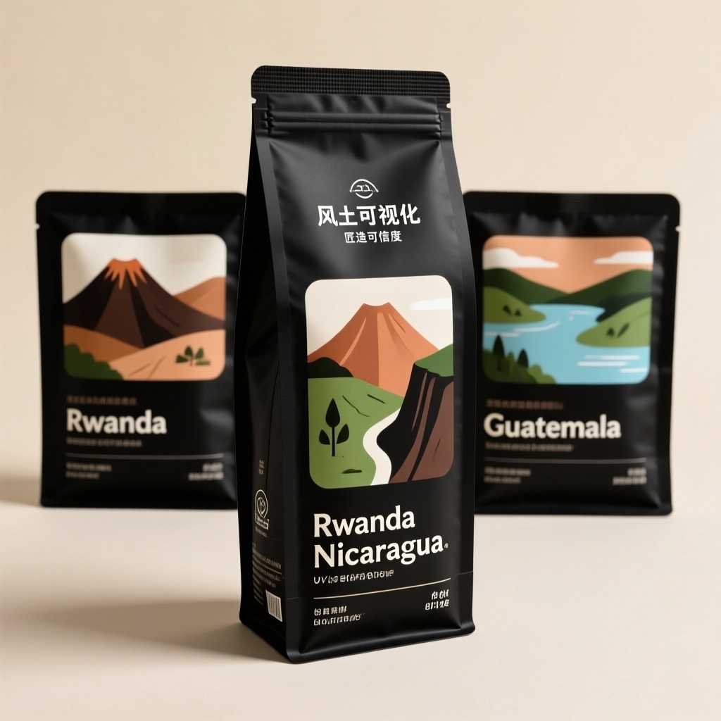 围绕现代极简主义风格,设计三款哑光黑咖啡挂耳袋包装。面向注重产地叙事与工艺权威的精品咖啡烘焙商,融入品牌核心价值——“风土可视化”与“匠造可信度”。设计内容为每袋正面中央呈现一幅原创扁平化矢量抽象几何插画,分别隐喻卢旺达火山地形、危地马拉高原峡谷、尼加拉瓜湖泊群岛,配以粗厚大地色块(赭石、苔绿、炭褐);产地名“Rwanda”“Guatemala”“Nicaragua”采用纤细中性无衬线体,居中排布于插画下方;整体构图留白充沛。颜色主调为哑光黑,辅以自然大地色系插画。材质选用食品级可回收哑光复合膜,用局部UV微凸工艺强化插画轮廓与文字,提升指尖触感与视觉层次;成片为高清静物摄影,置于中性米 beige 背景,超写实质感。