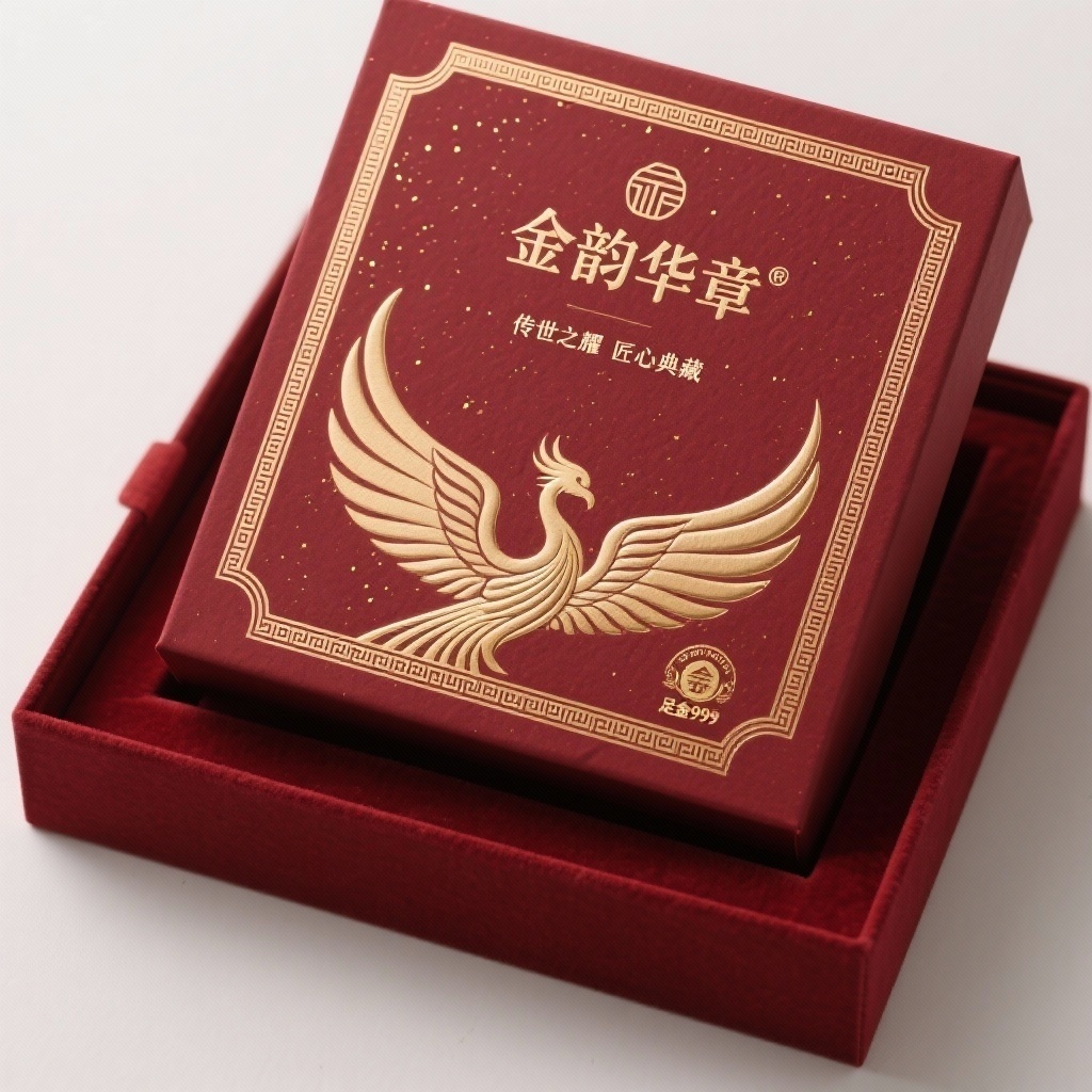 - **设计元素**:背景层为哑光深红底+细微金粉洒点肌理;主图案为抽象化凤凰翎羽线条组合,采用浮雕压印工艺;装饰线条为双层描金回纹边框;小图标含品牌徽记与“足金999”认证标识;材质选用特种艺术纸带触感涂层,呈现柔韧丝绒质感。