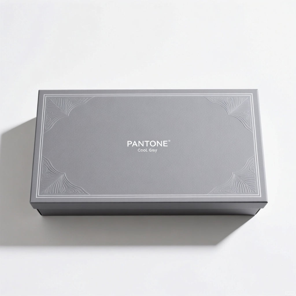 围绕极简克制的现代礼盒美学,设计扁平化长方体天地盖礼盒(高度显著低于长宽,比例约1:3:4),面向追求低调质感与实用仪式感的轻奢礼品受众。融入原样机图固有表面纹理(无新增图案),设计内容为闭合状态下完整呈现盒体结构:上盖与底托严丝合缝,侧边线条利落,盒盖边缘微倒角。颜色严格采用Pantone Cool Gray 5C纯灰色(全表面一致)。材质选用350g哑光灰卡纸,用高精度浮雕压纹复刻原样机肌理,并在盒盖四边施以局部透明UV高光工艺,增强扁平结构的光影层次与3D真实感。背景为纯白无缝影棚环境,确保视觉聚焦于礼盒本体。