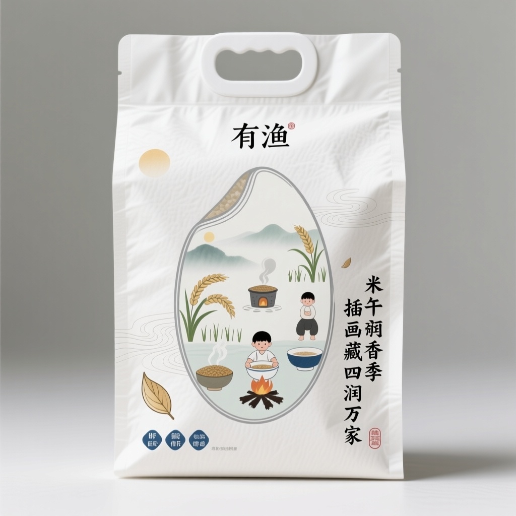 - **包装主视觉面排版**:采用“中心聚焦+文字环引式排版”——画面正中央由6幅极简淡彩插画(晨雾插秧、午阳弯穗、暮归担谷、灶火蒸烟、碗中热气、孩童捧碗)无缝咬合拼成饱满立体米粒轮廓,边缘用0.3pt灰线轻勾统一形体;品牌名“有渔”以瘦金变体横向悬浮于米粒正上方1.5cm处,无衬底,字距宽松如云间落款;宣传语分两行纵向排列于米粒右下45°斜角,字体为手写钢笔体,随视觉动线自然下滑,如风吹稻语,形成“图聚中央,文引四方”的视觉引力场。
