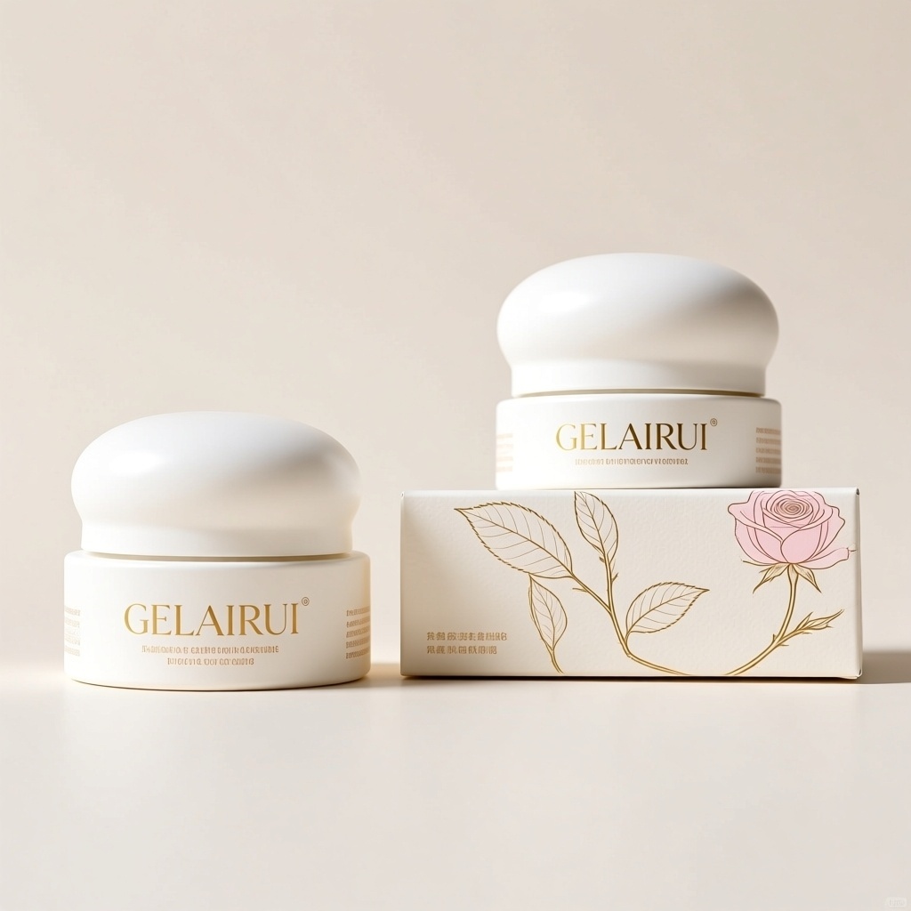 围绕简约自然风格,强调植物本真与温润质感,设计面霜礼品盒——圆柱形天地盖礼盒。面向追求天然成分、低调优雅与可持续理念的轻熟龄都市人群,融入品牌名“GELAIRUI”,以纤细衬线字体居中置于盒盖下方。设计内容为正面视角主视觉面:盒盖中央呈现一枝舒展的手绘感单枝玫瑰线描图,线条细腻流畅、疏密有致,保留大量留白以呼应自然呼吸感。颜色采用米白色为主底色,玫瑰轮廓与品牌文字以浅粉金色呈现,盒体侧面过渡为哑光纯白色,整体清雅柔和。材质选用米色再生艺术纸,表面覆哑光触感膜,玫瑰图形及品牌标识采用浅粉金烫金工艺,在柔光下呈现温润金属光泽,显著提升包装高级感与环保质感。背景干净,突出真实纸张肌理与印刷精度,图文排版均衡静谧。