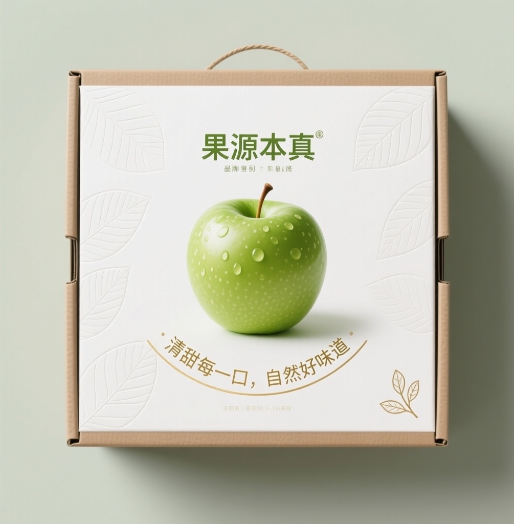 - **设计元素**:哑光牛皮纸材质背景层,中央高清水滴光泽苹果主图案,四周浅浮雕叶脉纹理装饰,品牌名下方加衬细金线色块,角落点缀极简枝叶小图标,边缘压印轻微磨砂触感线条