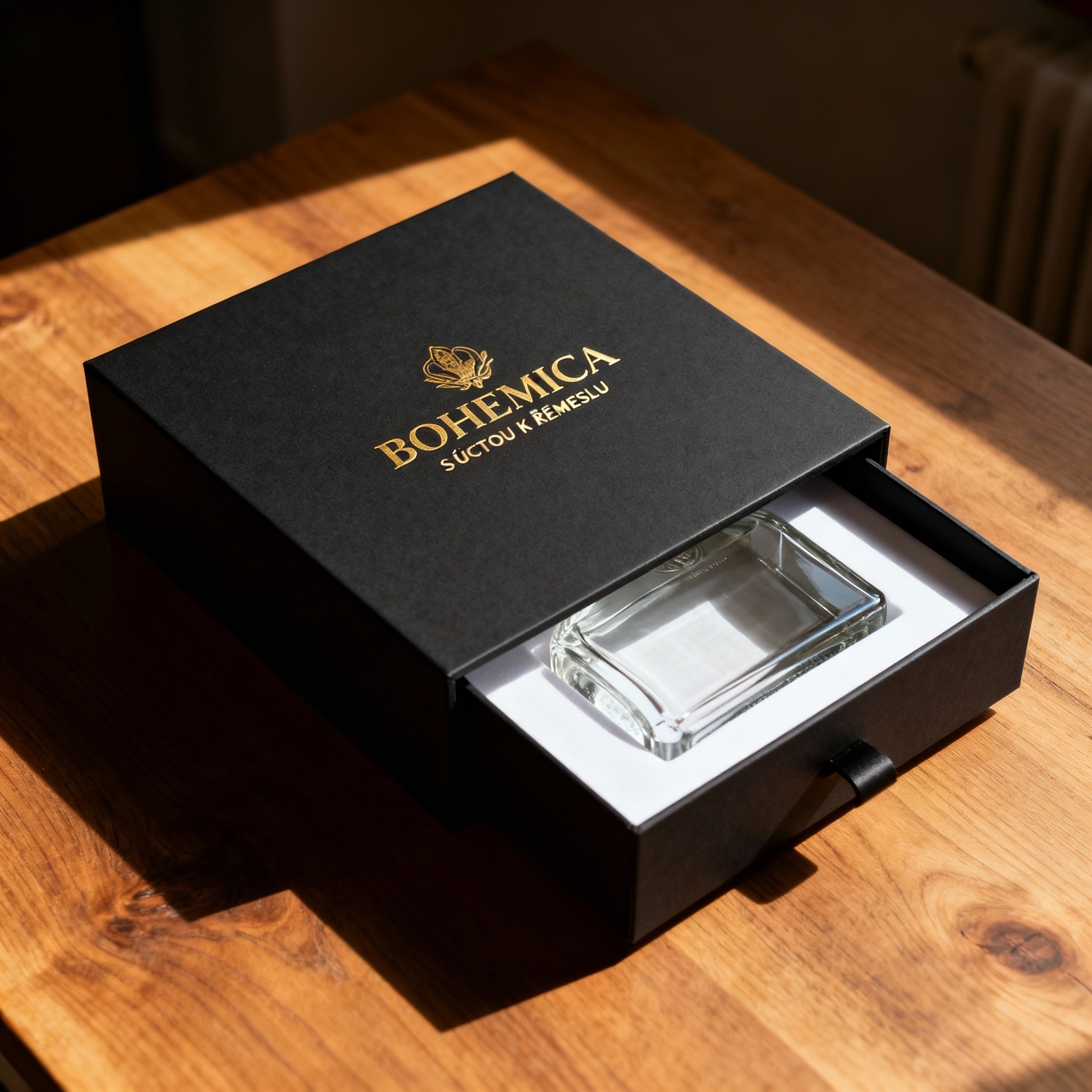 一个高端的黑色抽屉式酒盒,放在木质桌面上,沐浴在温暖的阳光中。**最关键的是,盒子的外观必须是一个视觉上非常接近正方形的形状,彻底消除任何狭长感。** 抽屉被拉出约一半,清晰地展示出内部白色衬垫和一个扁平的透明玻璃酒瓶,此时只能看到酒瓶的下半部分。盒子是纯黑色哑光材质,正面有精致的金色'BOHEMICA'品牌标识和'S ÚCTOU K ŘEMESLU'副标题,风格简洁而奢华。整体构图为方正或竖向。