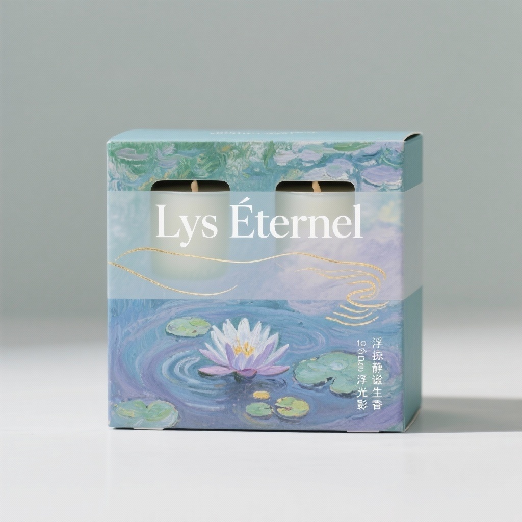 - **包装主视觉面排版**:满版排版——莫奈《睡莲》局部油画作为整个主视觉面背景,标题“Lys Éternel”以优雅衬线体横向置于盒面中上部,使用半透明白色描边增强可读性,宣传语分两行小字垂直排列于右下角,整体营造沉浸式艺术氛围