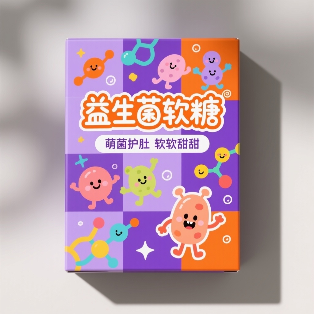 - **设计元素**:生动拟人化益生菌卡通图案(带笑脸与手脚)、抽象化彩色分子链装饰图形、手写风格品牌文字、几何色块拼接背景(常春紫与活力橙交错拼贴)、点缀性星星与气泡小图标;纸质选用哑光覆膜材质,触感柔和有亲和力