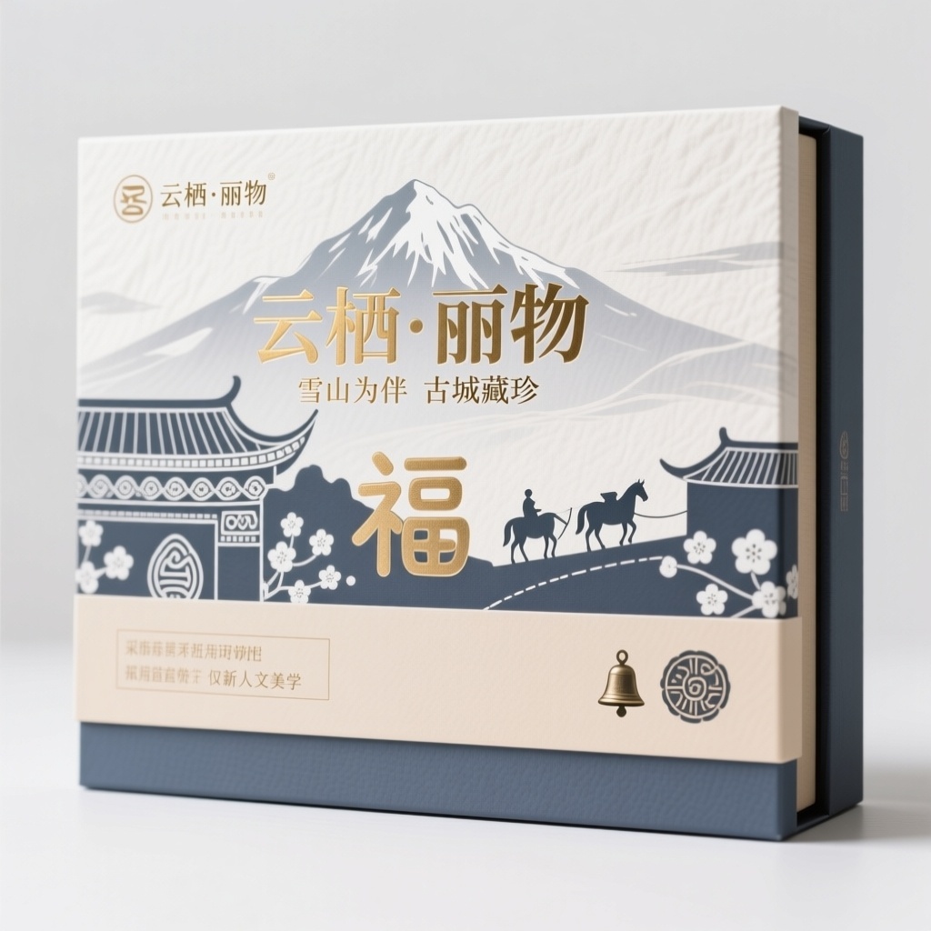 - **包装主视觉面排版**:覆盖式排版(玉龙雪山轮廓作为半透明水印衬于文字下方,主标题“云栖·丽物”置于中央偏上,采用烫金立体字加深色描边,副标宣传语横向排列于主标题正下方,通过浅米色哑光色块托底提升可读性)
