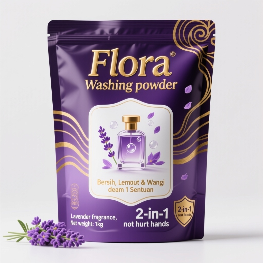 - **包装主视觉面排版**:覆盖式排版——深紫色背景上金色波纹线条环绕中央微型香水瓶图案,瓶身散发透明气泡与飘落写实薰衣草花瓣;品牌名“Flora Washing powder”以烫金立体字横向横跨顶部1/5区域;中部偏下叠加半透明白色衬底框突出“Bersih, Lembut & Wangi dalam 1 Sentuhan”金色波纹文字;右下角“2-in-1 not hurt hands”用粗体白字加金边强化功能提示;左下角薰衣草小簇旁标注“Lavender fragrance, Net weight: 1kg”采用细体金字竖排。