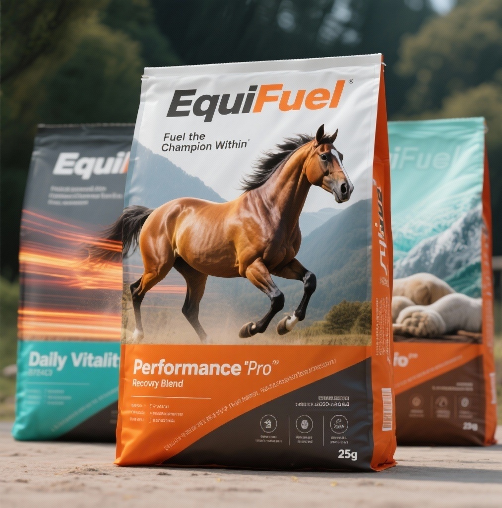 - 正面:骏马高清摄影图占据中心70%面积,品牌名“EquiFuel”以斜角粗体无衬线字悬浮于马肩上方,微透描边增强层次;宣传语沿马腹下缘弧形排布;右下角“25kg”嵌入专属色盾牌图标;