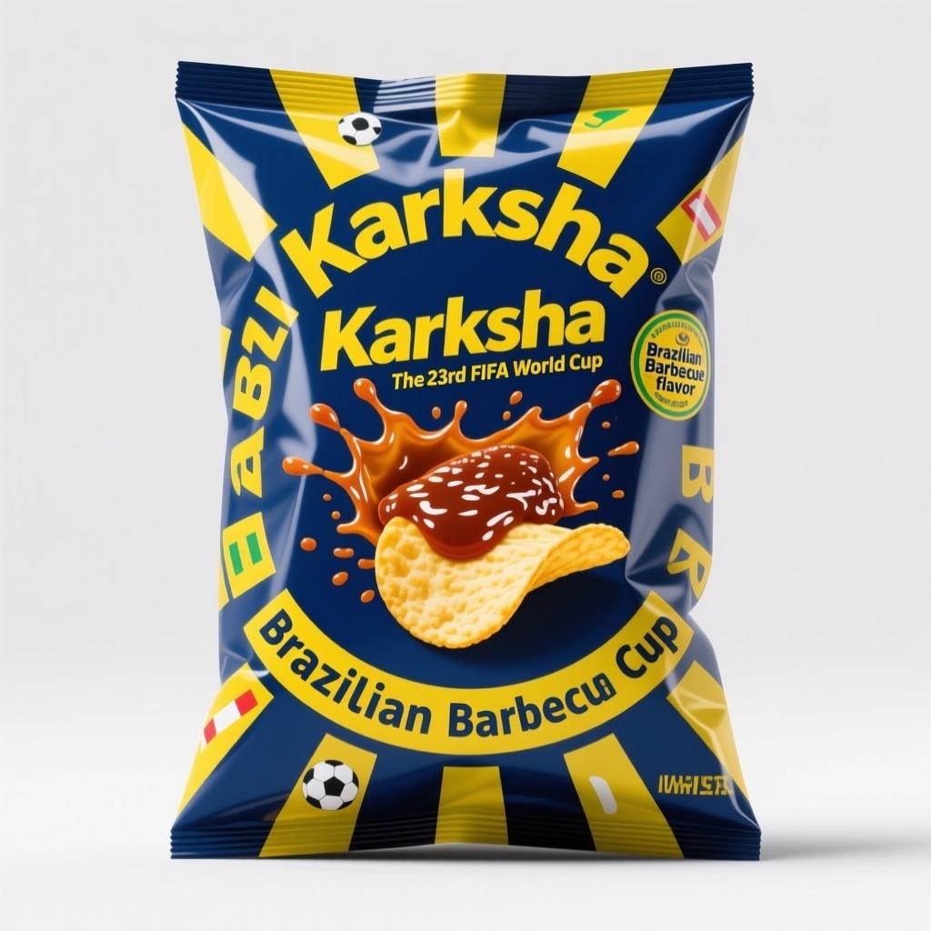 - **包装主视觉面排版**:环绕式排版(中央为高光烤肉酱薯片特写,四周放射状环绕“Karksha”品牌名碎片化字母与“Brazilian Barbecue flavor”风味徽章,底部弧形排列赛事口号形成球迷助威横幅;主图与文字形成向心构图,增强视觉凝聚力与赛场呐喊动感)