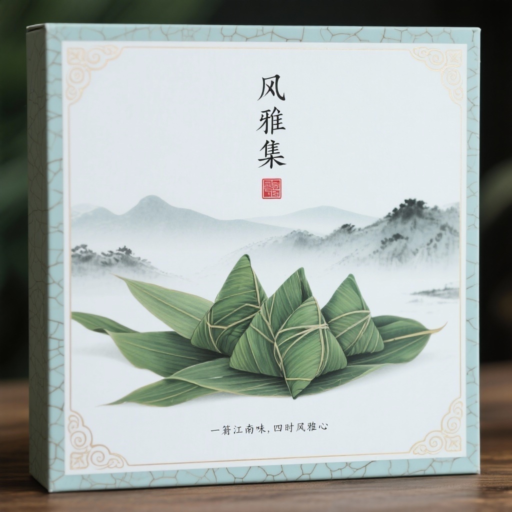 - **包装主视觉面排版**:上下排版(文字在上图案在下),封面顶部居中竖排书法标题“风雅集”,下方压朱砂方印一枚;中部至底部为虚实相生的主视觉画面——前景为写实粽叶层叠铺展,背景晕染宋代水墨山水长卷,slogan“一箸江南味,四时风雅心”以小楷横向排列于画面最底端,形成天地呼应、文图共生的古典阅读式构图。