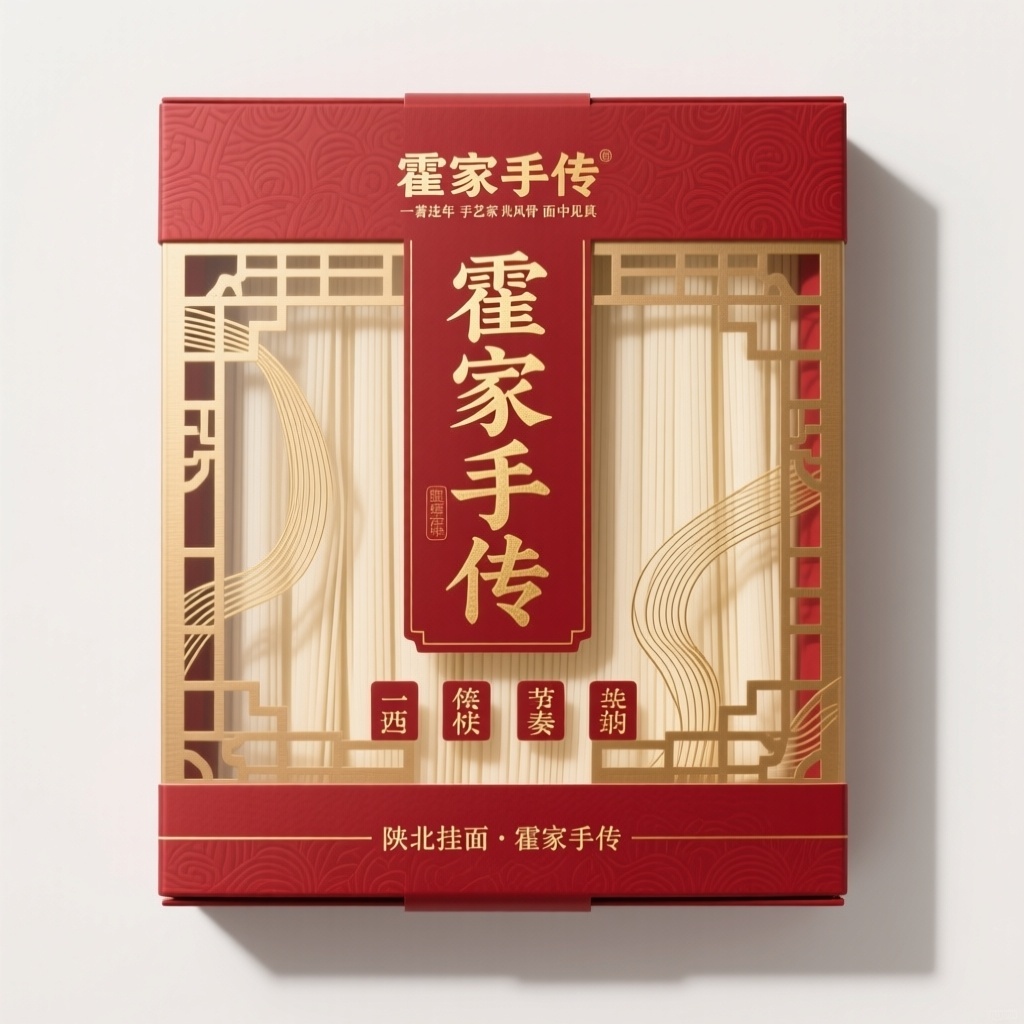 - **包装主视觉面排版**:以文字为主式排版(主标题文字居于主要位置突出显示,图案作为背景纹理或者点缀性装饰),中央垂直居中大字“霍家手传”采用粗宋体加烫金工艺,下方错落排列四组四字短语形成节奏韵律,背景透叠极淡金色挂面垂落线稿与陕北窗花纹样,底部横向小字“陕北挂面·霍家手传”压脚收束,整体如卷轴展开般庄重典雅