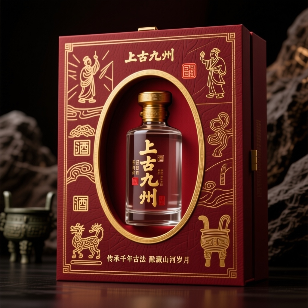 高端白酒包装设计,天地盖式礼品盒,深绛红色厚实哑光卡纸材质,表面有细密仿古籍纸张纹理。包装正面居中展示透明玻璃酒瓶,瓶内酒体清澈。酒瓶后方衬以深绛红色椭圆形金色边框图章组合,包含"上古九州"金色篆书字体、朱砂印章式"酒"字、版本信息。背景层有烫金仿古岩画风格线刻图案:祭祀人形、瑞兽、青铜器轮廓、抽象符号。盒盖与盒身交接处及侧棱边缘使用烫金细线勾勒。品牌宣传语"传承千年古法 酝藏山河岁月"以金色字体环绕于瓶身两侧。新中式奢华风格,历史神秘感,高端典雅,产品摄影效果,柔和光影,深色背景。