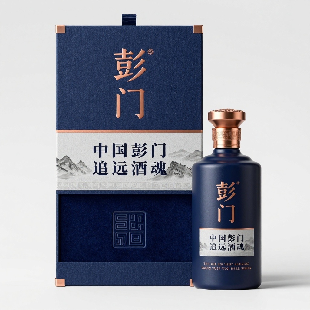 - **设计元素**:深靛蓝棉麻纹理特种纸盒体,触感温润;“彭门”篆字采用凹印叠加古铜箔烫印;宣传语使用纤细宋体阴刻于浅灰底衬之上;瓶身贴标复刻盒面排版,缩小比例居中贴合;盒内衬藏青丝绒,中央压印同款回纹章;四角包覆哑光古铜金属窄边条。