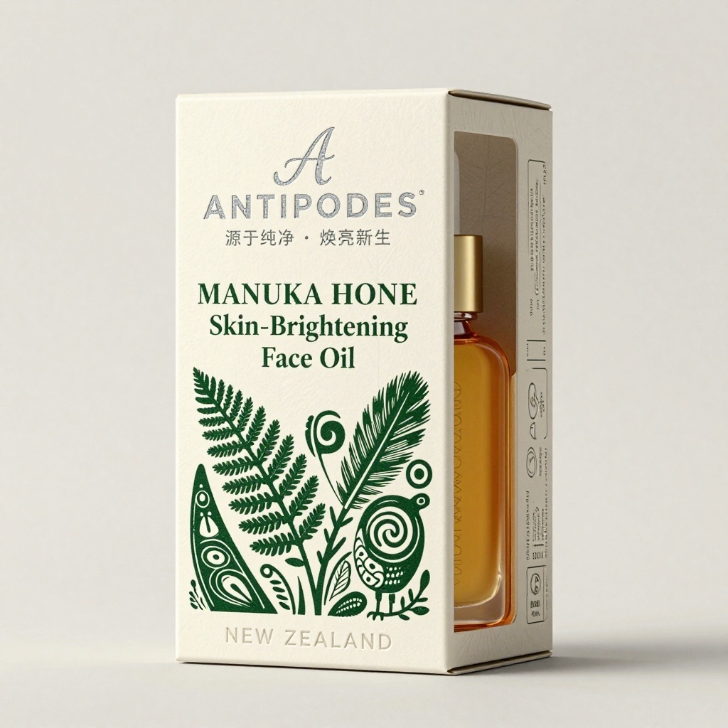 - **包装主视觉面排版**:上下排版(文字在上图案在下)——顶部居中排列品牌名“ANTIPODES”与手写体“A”标识,中部清晰标注产品名称“MANUKA HONEY Skin-Brightening Face Oil”,底部大面积展示深绿色毛利图腾插画,包含蕨叶、鸟羽与藤蔓元素,下方压印“NEW ZEALAND”产地字样,整体形成从品牌到文化再到产品的视觉阅读动线。