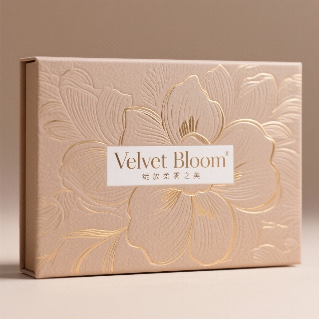 - **包装主视觉面排版**:纹理式排版(品牌名“Velvet Bloom”以优雅衬线字体横向居中排布于主视觉面中央,字母笔画纤细精致,下方搭配宣传语“绽放柔雾之美”以较小字号无衬线体排列;背景满铺抽象花卉浮雕纹理,浅咖色底纹通过凹凸压印工艺营造触觉层次,文字区域轻微提亮或叠加半透明白色衬底以增强可读性,视觉侧重点兼顾品牌识别与肌理艺术感)