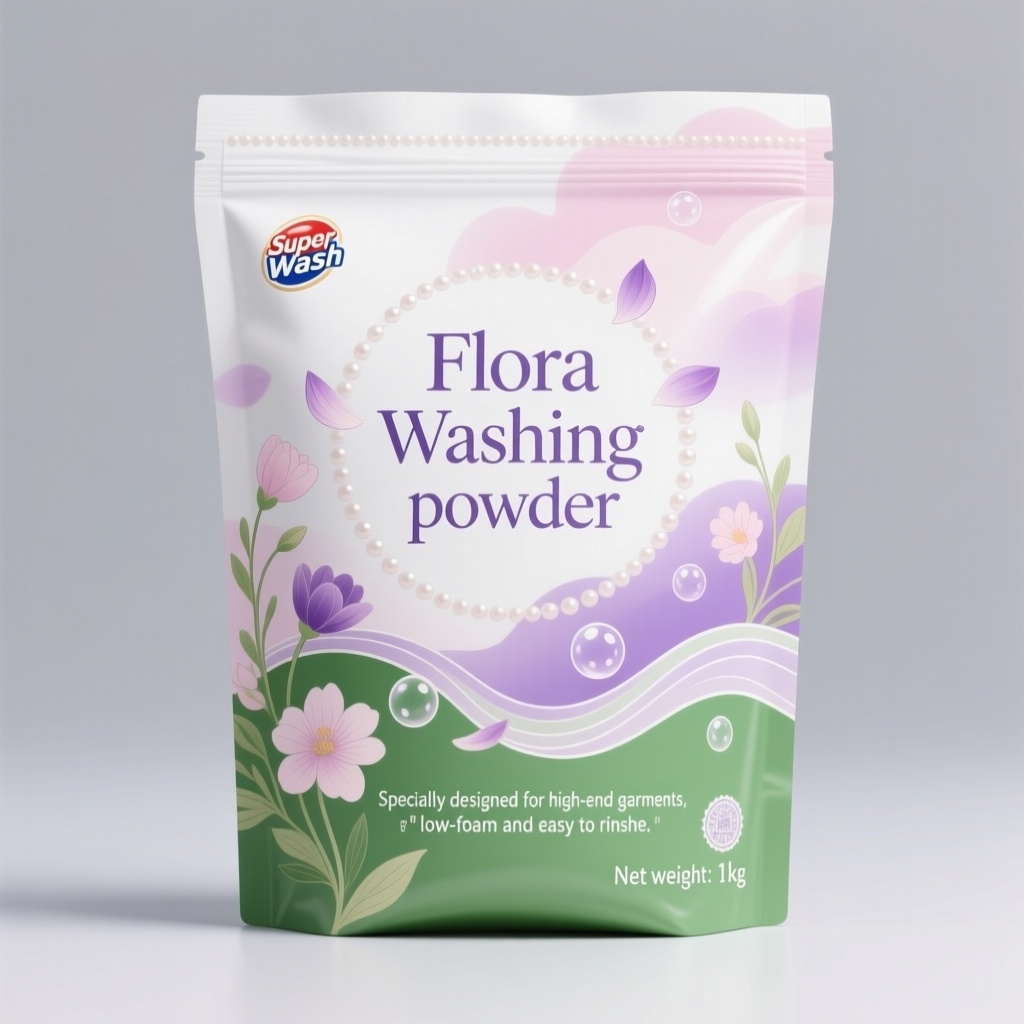 - **品牌名及宣传语**:Flora Washing powder / Specially designed for high-end garments, low-foam and easy to rinse