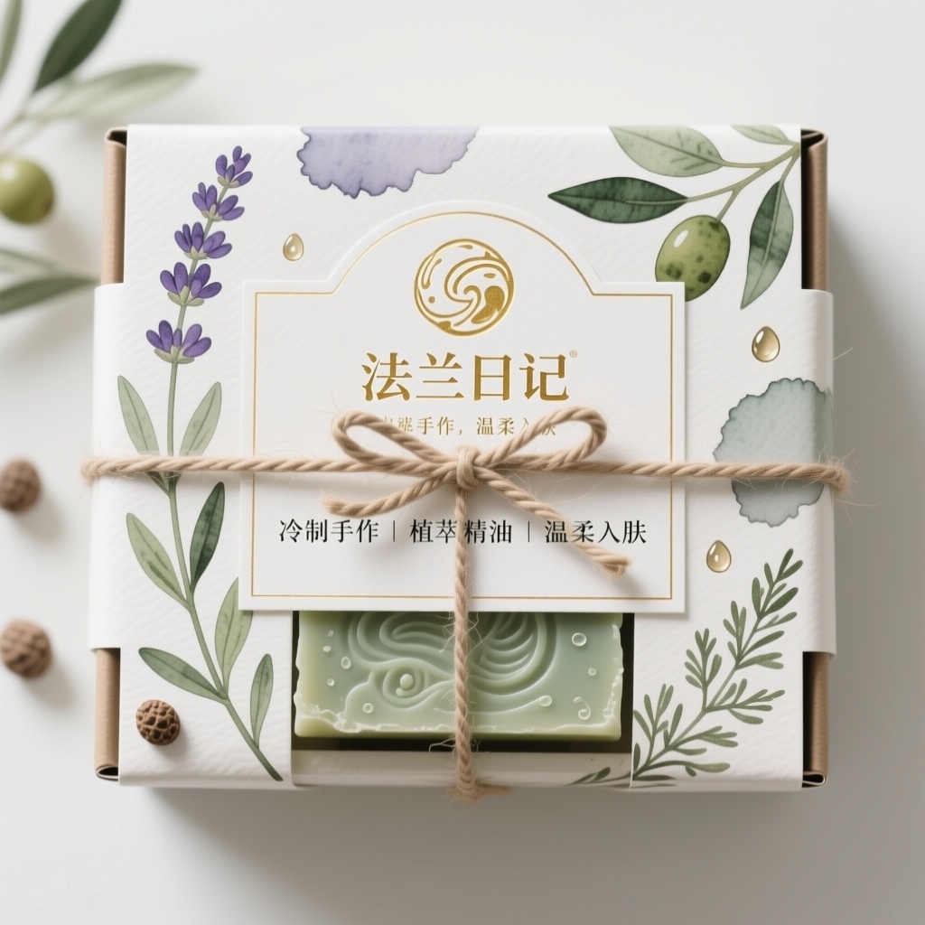 - **包装主视觉面排版**:满版排版(背景为全幅手绘薰衣草与橄榄枝水彩纹理,品牌Logo以烫金浮雕形式居中偏上悬浮,下方错落排列三组四字短语:“冷制手作|植萃精油|温柔入肤”,文字块采用半透白底衬+细金框分隔,形成呼吸有序的阅读动线)
