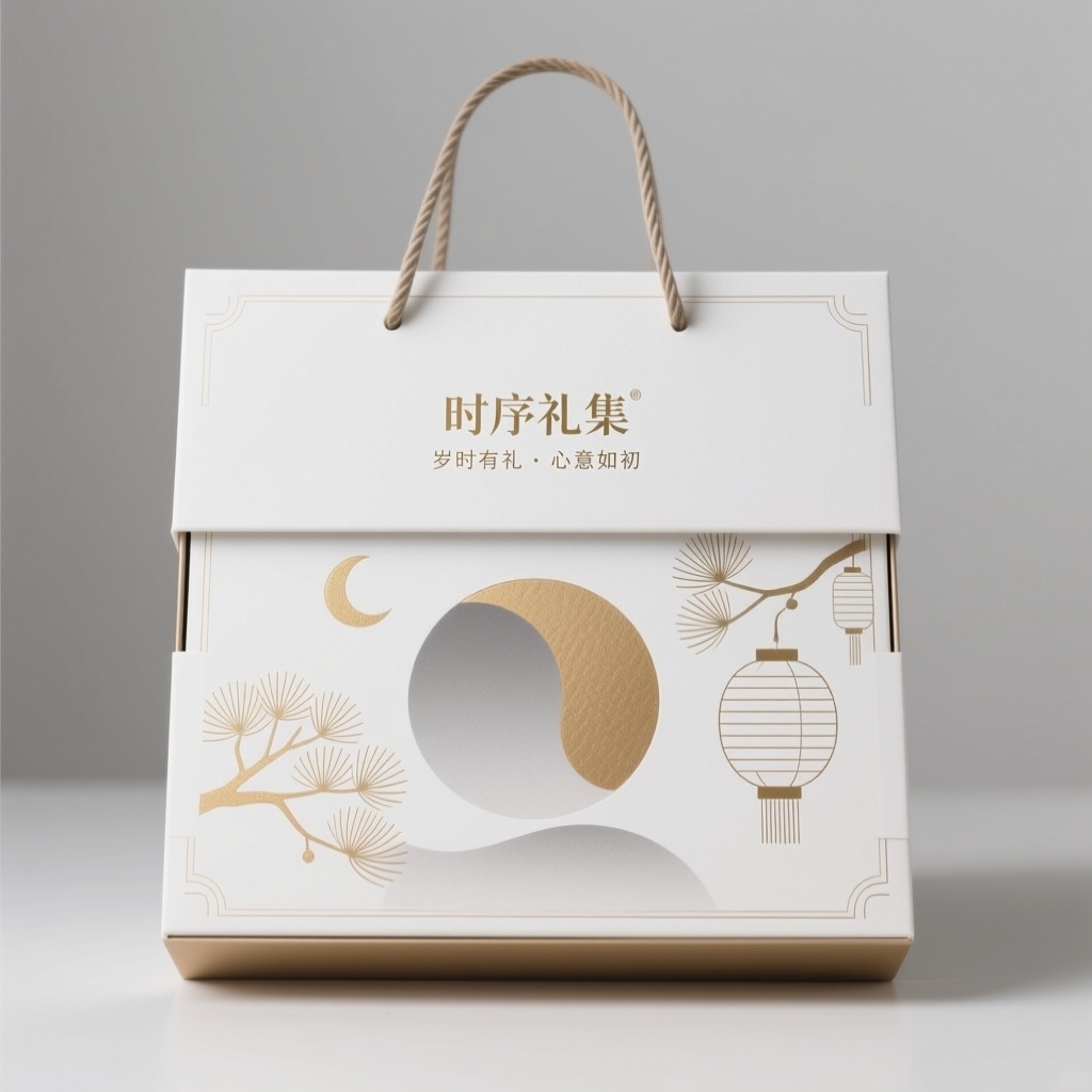 - **包装主视觉面排版**:上下排版(文字在上图案在下)——顶部居中放置品牌名与宣传语,采用无衬线字体错落排列形成节奏感;底部为极简抽象节庆元素图案(如月相、松枝、灯笼轮廓),图案占比约40%,整体留白充足,视觉重心稳定且呼吸感强