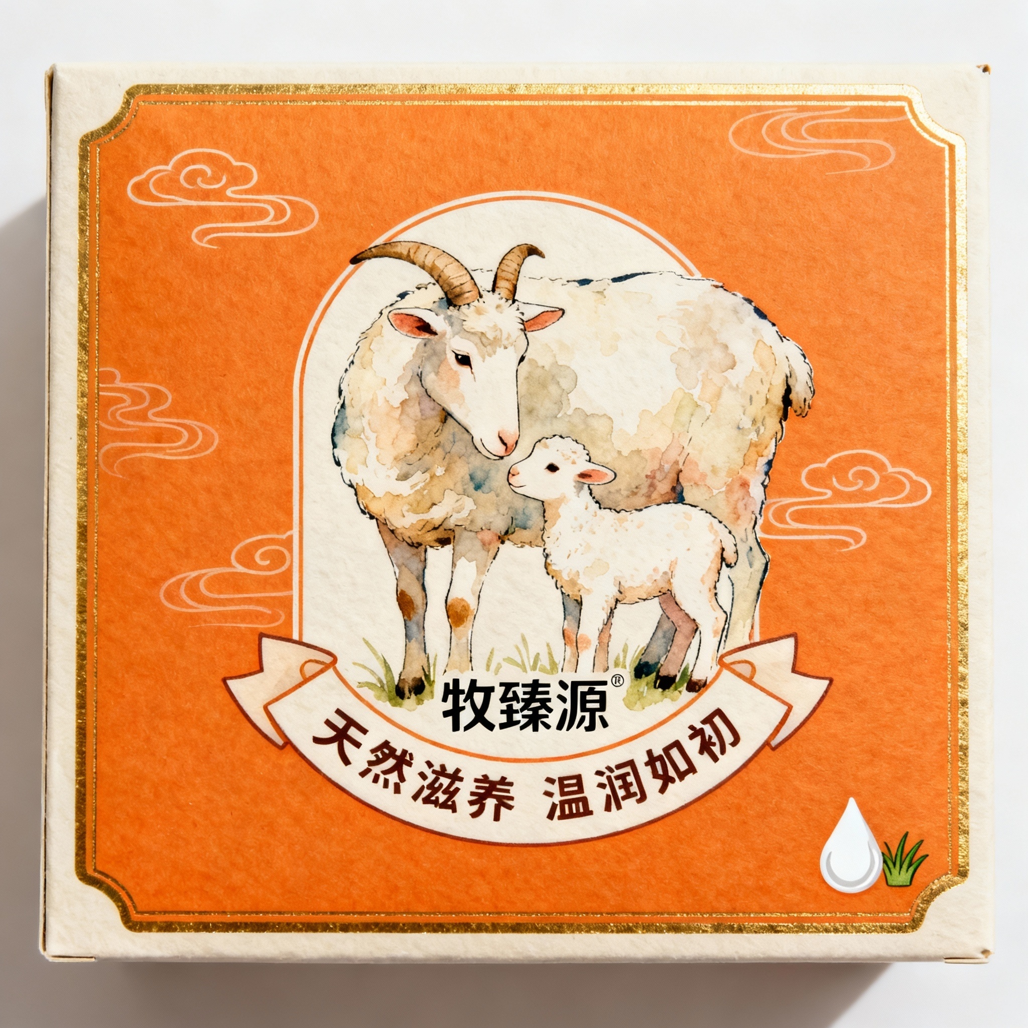 - **设计元素**:背景层为哑光橙色纸基材质,主图案为柔和水彩风格母羊与小羊互动插画,四周装饰极简祥云流线纹样,边缘点缀金色细线勾边,角落嵌入奶滴与草叶小图标,整体呈现温润触感与天然气息