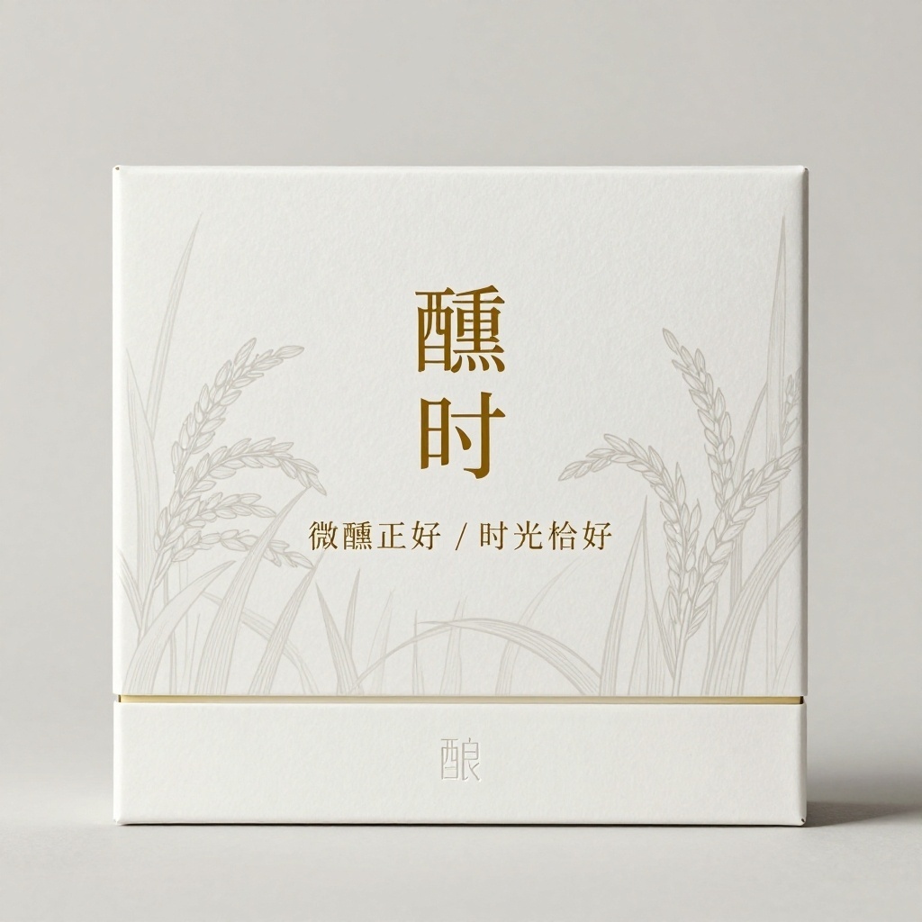 - **包装主视觉面排版**:覆盖式排版(图案衬于文字下方,文字通过半透明白色哑光色块突出),主视觉中央纵向排列“醺时”品牌名,下方错落排布“微醺正好 / 时光恰好”宣传语,背景为极简线描风稻穗轮廓以20%透明度铺底,文字区叠加磨砂质感白框强化聚焦,整体营造轻盈通透的呼吸感与层次