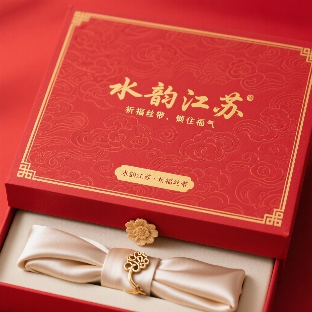 - **设计元素**:背景为酒红哑光特种纸压印金色祥云暗纹;主视觉为烫金书法“水韵江苏”+细体金文副标;装饰含边角回形纹金线描边、盒盖中央嵌绒花胸针凹槽位;内衬为米白丝绸质感托布,丝巾叠放呈如意形,附磁吸开合结构。