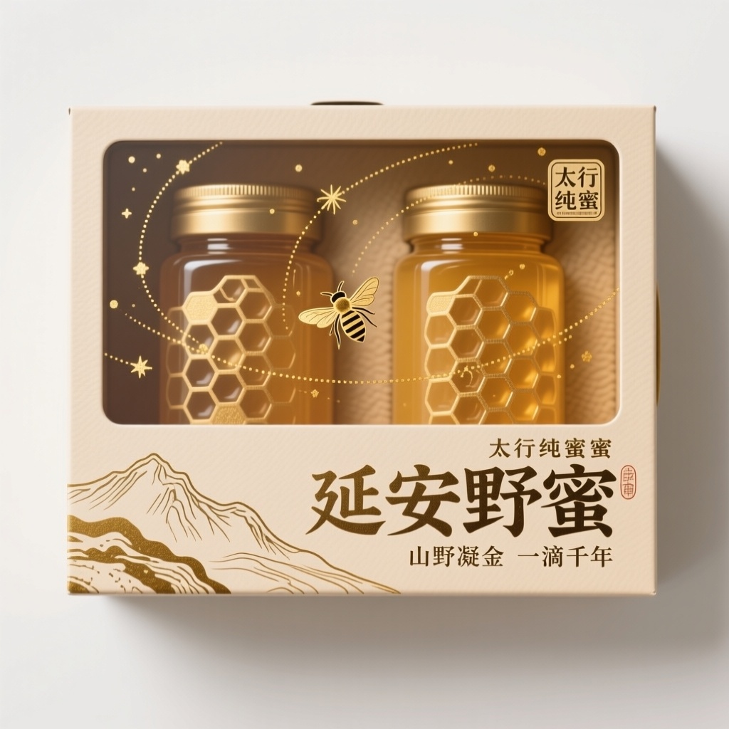 - **设计元素**:黄土高原极简线描、负空间蜂巢透光肌理、活蜂飞行轨迹烫金点阵、岩刻体阴文"延安野蜜"章、可降解竹纤维层压山纹,表面触感模拟天然岩层与蜂蜡交融质感