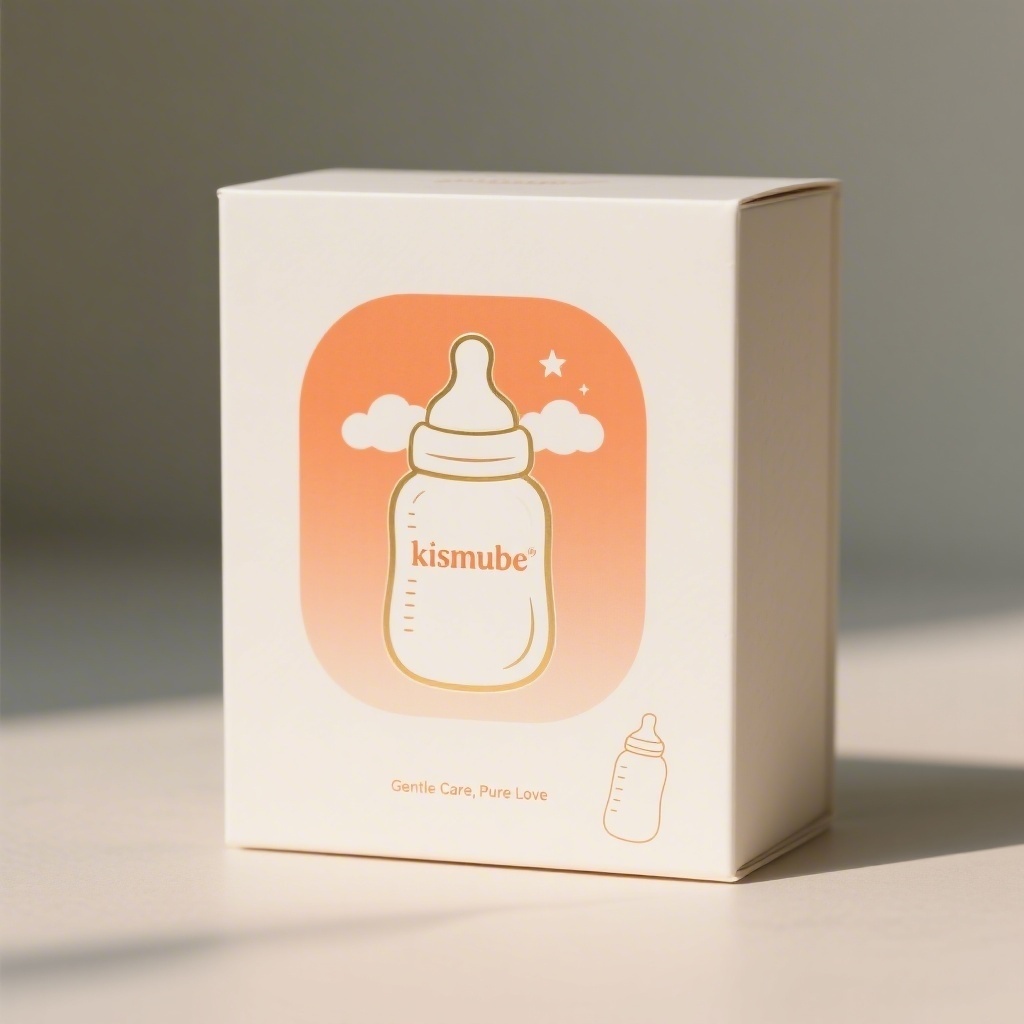 - **包装主视觉面排版**:覆盖式排版(柔和渐变橙色背景衬于文字下方,品牌名“kismube”居中以粗衬线字体置于白色半透明白色圆角矩形色块上,下方小字宣传语轻盈排列,右下角点缀简约奶瓶线稿图案)
