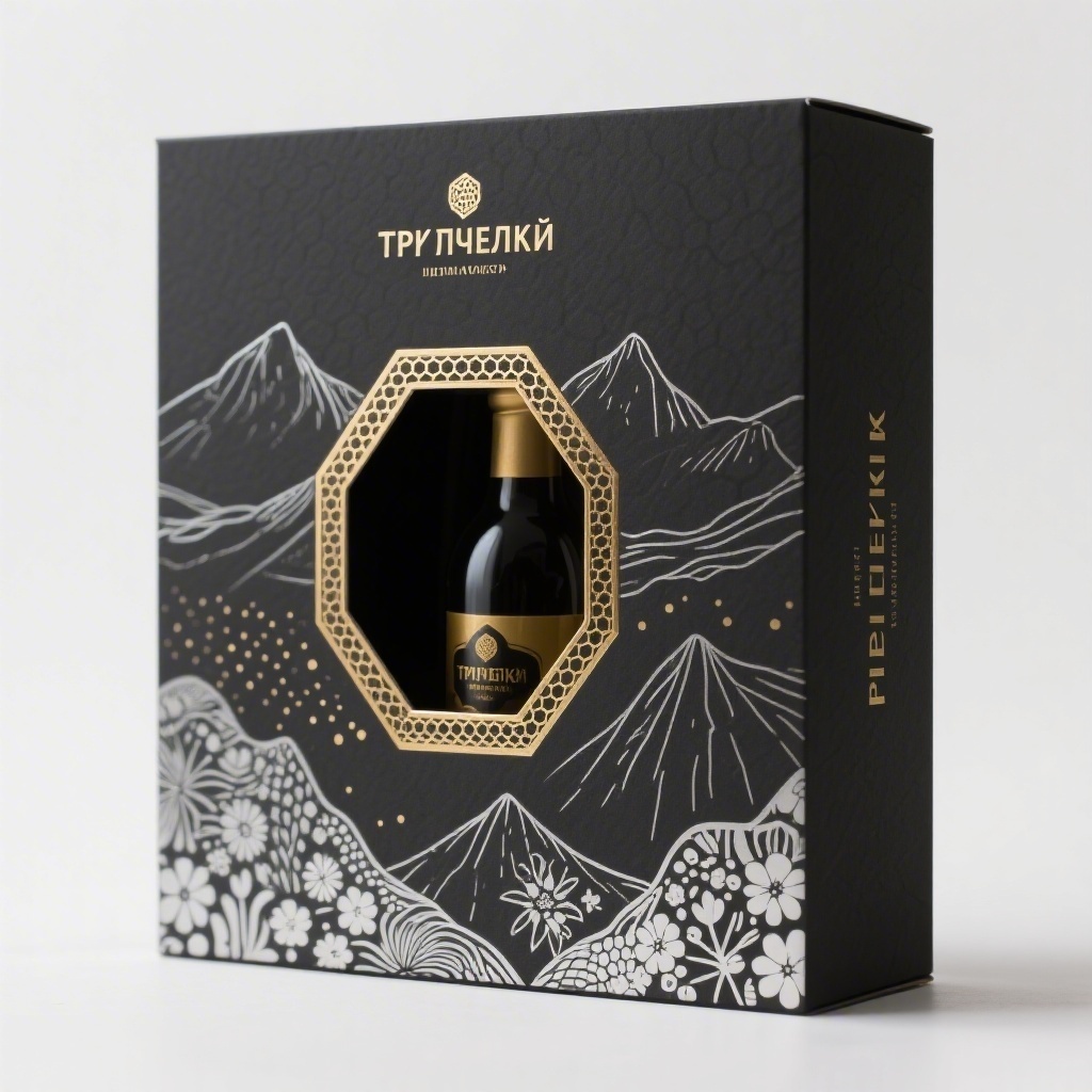 - 品牌标识“ТРИ ПЧЁЛКИ”垂直排列于盒体一侧,采用无衬线西里尔字母,逆向UV+局部烫金,与开窗形成非对称平衡。