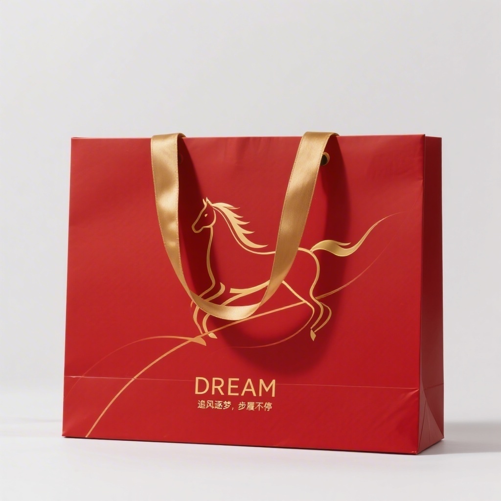 - **设计元素**:哑光正红色加厚铜版纸基底;单条流畅金色线条勾勒动态抽象马形图案;底部简约金色无衬线“DREAM”字样;无装饰边框或辅助图形;手提带为金色缎带材质,与主视觉金色元素呼应