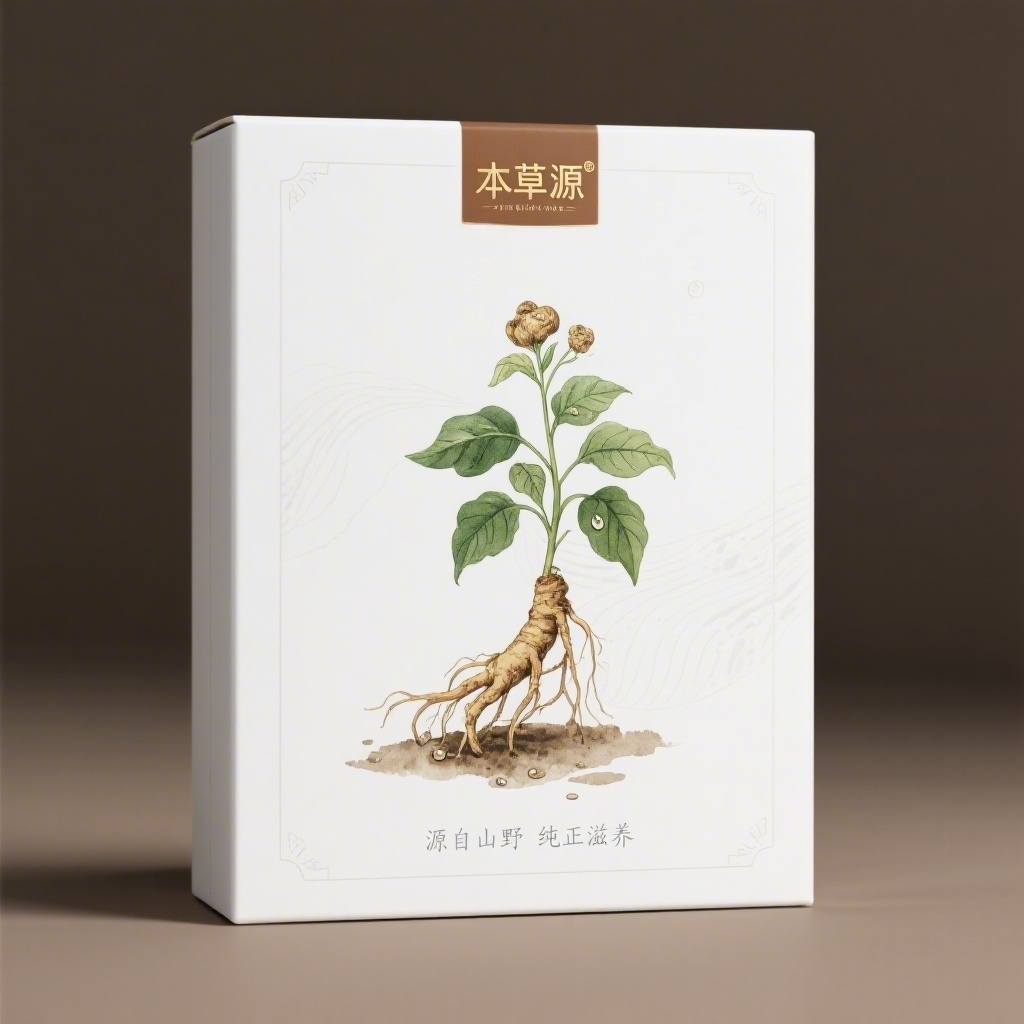 - **包装主视觉面排版**:以商品为主式排版(一株写实手绘风格三七植物居于视觉中心,根茎舒展自然,叶片错落有致;品牌名置于顶部居中,宣传语分两行置于底部,采用衬线字体与留白空间形成呼吸感,整体构图平衡且聚焦植物主体)